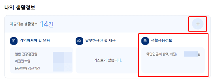 생활금융정보에 국민연금 예상액이 세전으로 표시되는 것을 보실 수 있습니다.