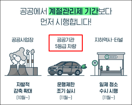 공공사업장에서는 자발적 감축을 10월부터 실시하고, 공공기관 5등급 차량의 경우 운행제한을 조기 실시합니다.