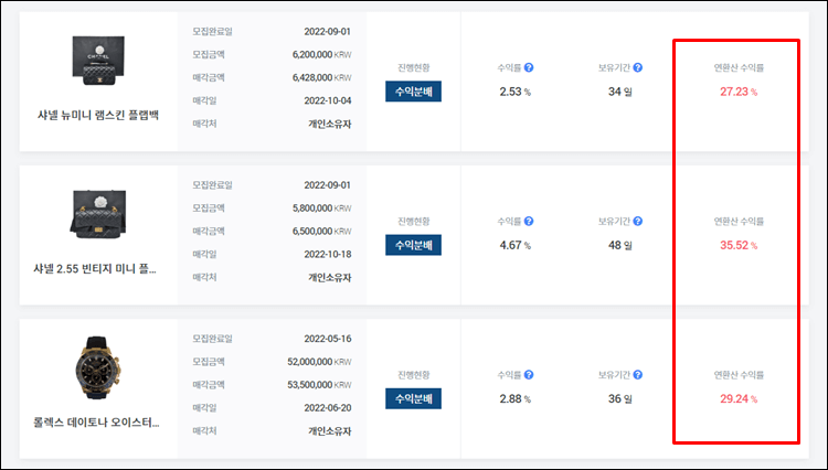이러한 명품들은 그림보다 더 빠른 회전율을 보여줍니다. 한 달 보유하고 2~5%의 수익을 보여줍니다.