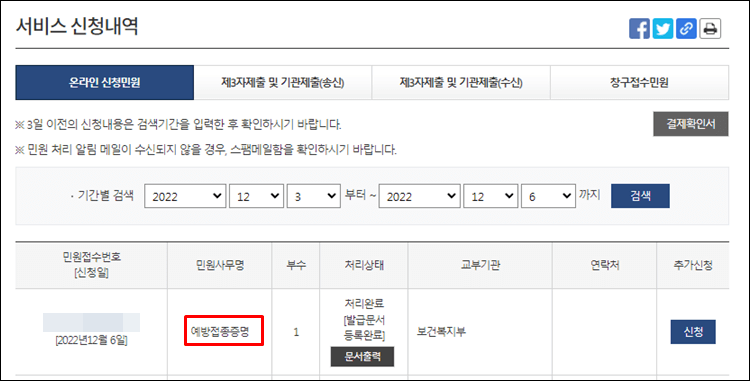 서비스 신청내역에 아래와 같이 예방접종 증명이 입력된 것을 보실 수 있습니다.