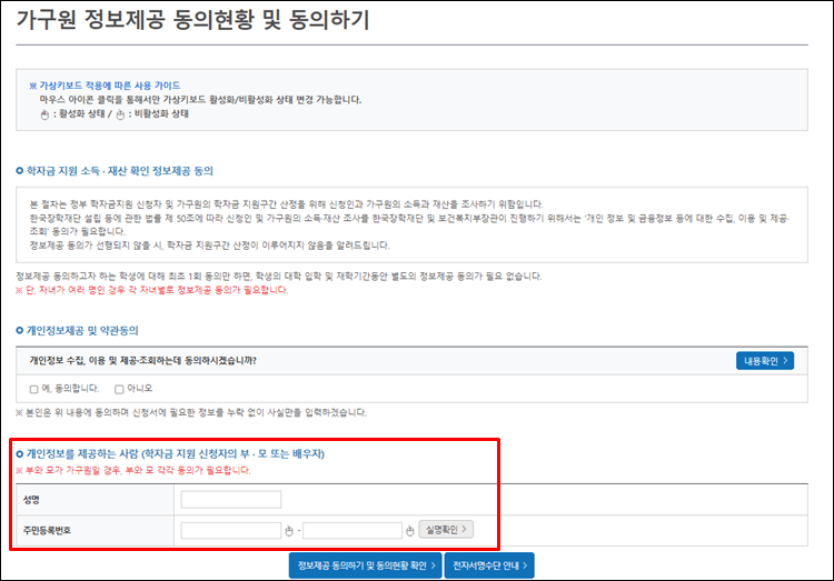 학자금지원구간표를 조회하기 위해서는 가구원 정보제공에 동의하여야 합니다.